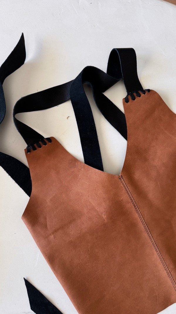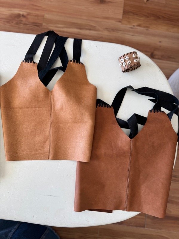 top de cuero trenzado, tiras en espalda que pueden usarse cruzadas o rectas.